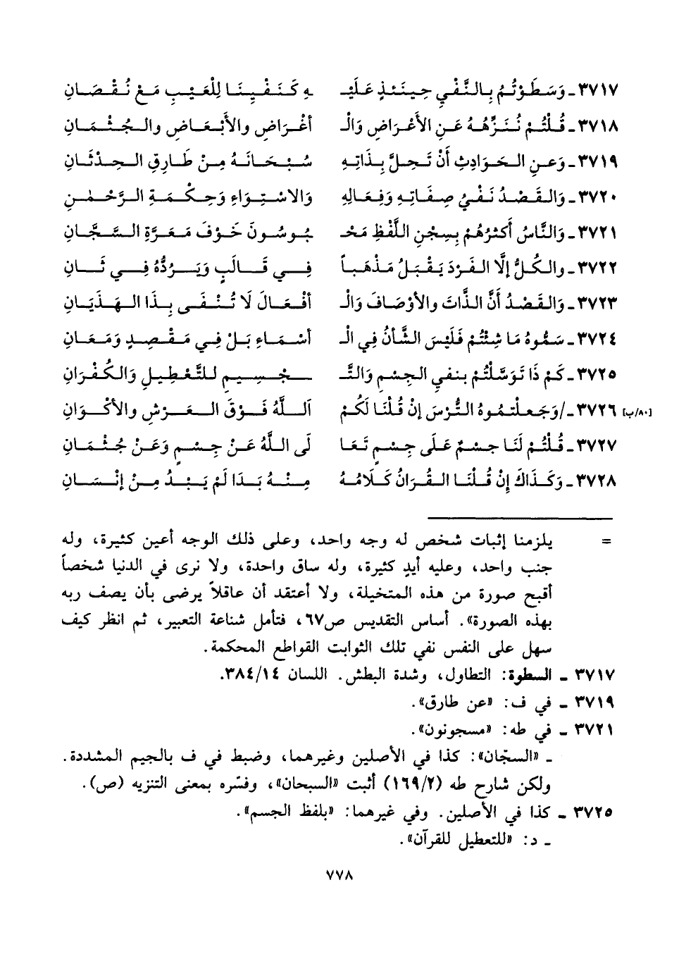 = يلزمنا إثبات شخص له وجه واحد، وعلى ذلك الوجه أعين كثيرة، وله جنب واحد، وعليه أيدٍ كثيرة، وله ساق واحدة، ولا نرى في الدنيا شخصًا أقبح صورة من هذه المتخيلة، ولا أعتقد أن عاقلًا يرضى بأن يصف ربه بهذه الصورة". أساس التقديس ص ٦٧، فتأمل شناعة التعبير، ثم انظر كيف سهل على النفس نفي تلك الثوابت القواطع المحكمة.