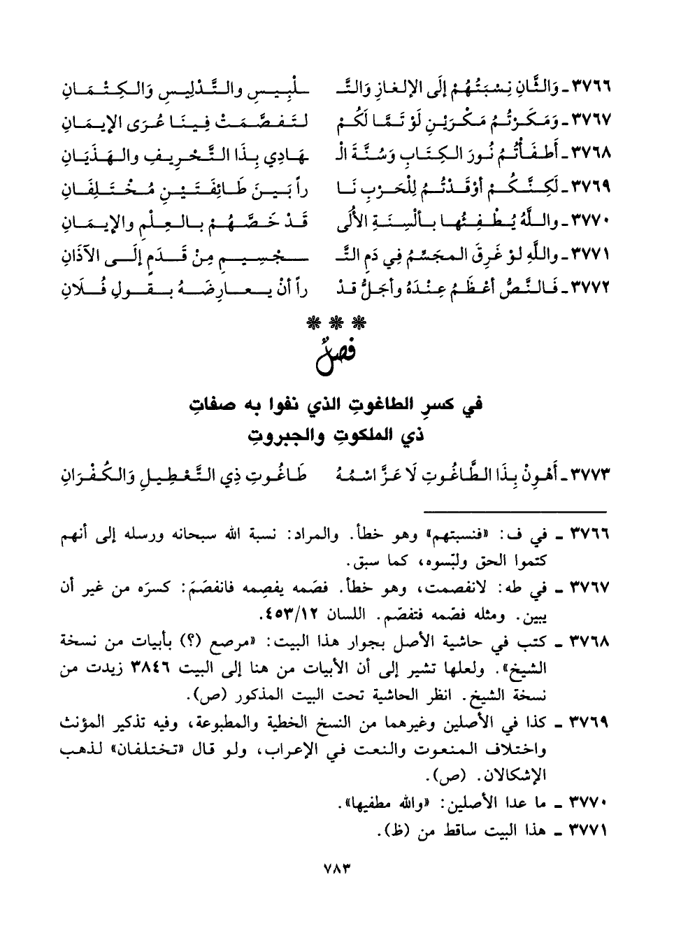 ٣٧٦٨ - كتب في حاشية الأصل بجوار هذا البيت: "مرصع (؟) بأبيات من نسخة الشيخ". ولعلها تشير إلى أن الأبيات من هنا إلى البيت ٣٨٤٦ زيدت من نسخة الشيخ. انظر الحاشية تحت البيت المذكور (ص).