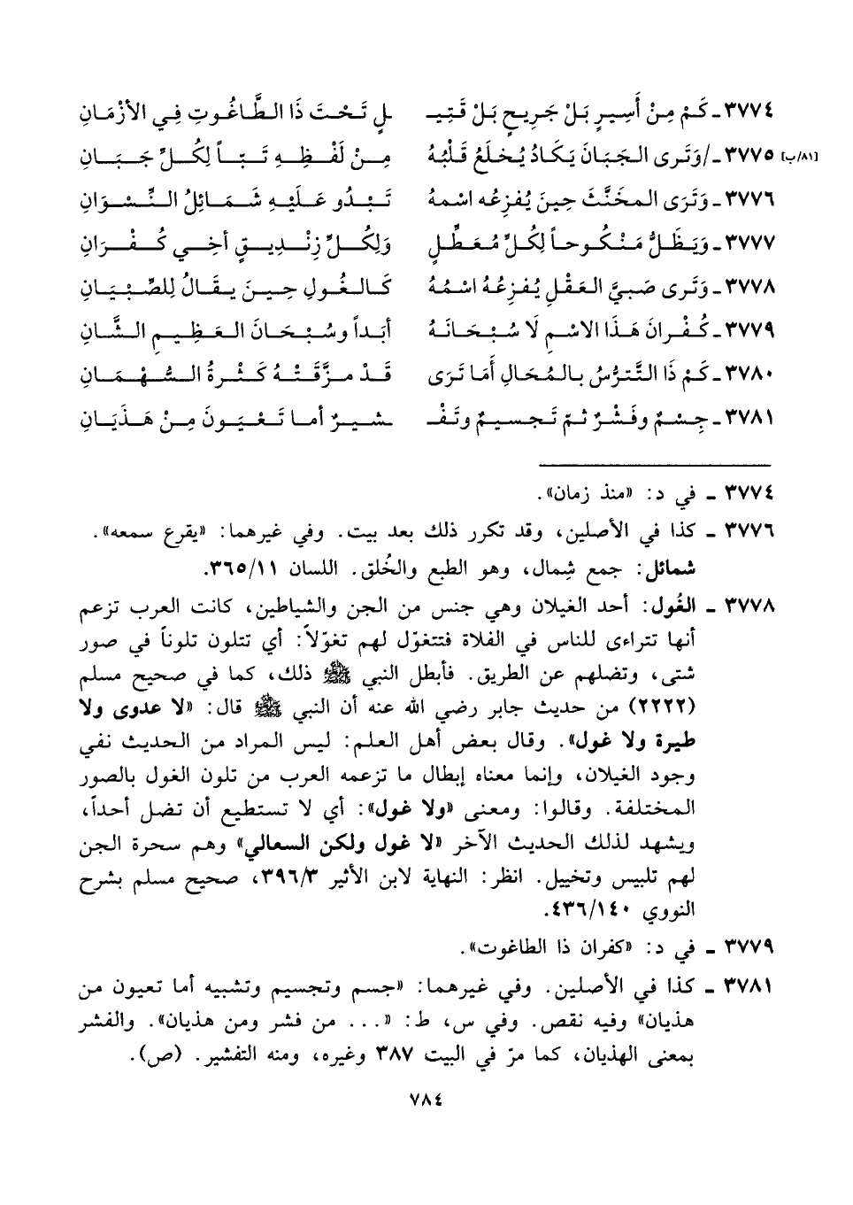 ٣٧٨١ - كذا في الأصلين. وفي غيرهما: "جسم وتجسيم وتشبيه أما تعيون من هذيان" وفيه نقص. وفي س، ط: " ... من فشر ومن هذيان". والفشر بمعنى الهذيان، كما مرّ في البيت ٣٨٧ وغيره، ومنه التفشير. (ص).