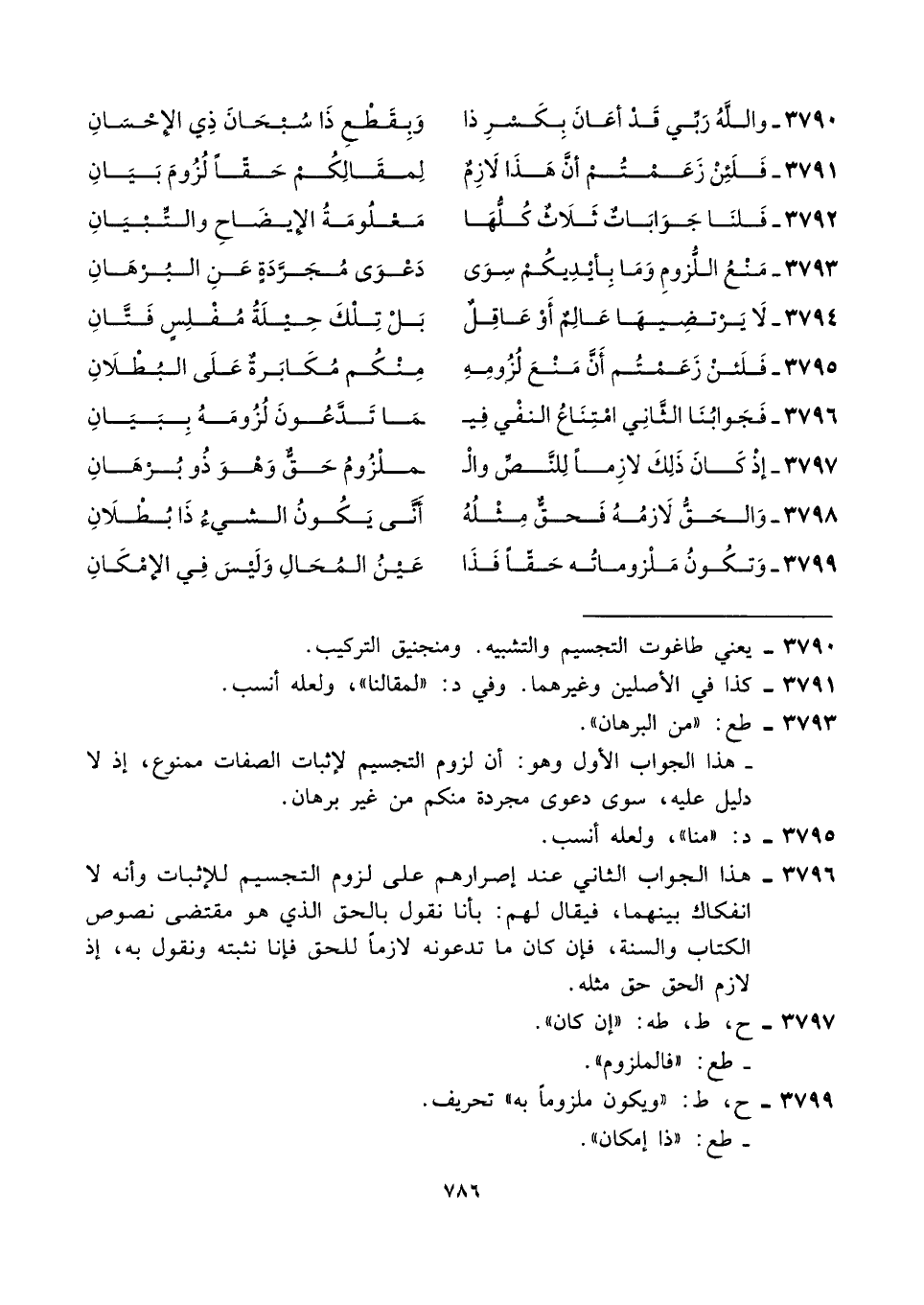٣٧٩٦ - هذا الجواب الثاني عند إصرارهم على لزوم التجسيم للإثبات وأنه لا انفكاك بينهما، فيقال لهم: بأنا نقول بالحق الذي هو مقتضى نصوص الكتاب والسنة، فإن كان ما تدعونه لازمًا للحق فإنا نثبته ونقول به، إذ لازم الحق حق مثله.