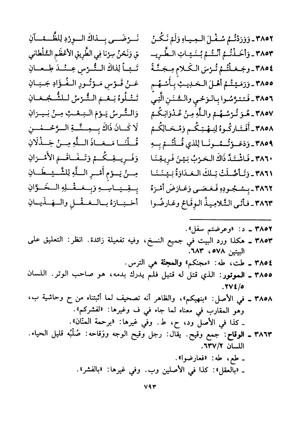 ٣٨٥٣ - هكذا ورد البيت في جميع النسخ، وفيه تفعيلة زائدة. انظر: التعليق على البيتين ٥٧٨، ٦٨٣.