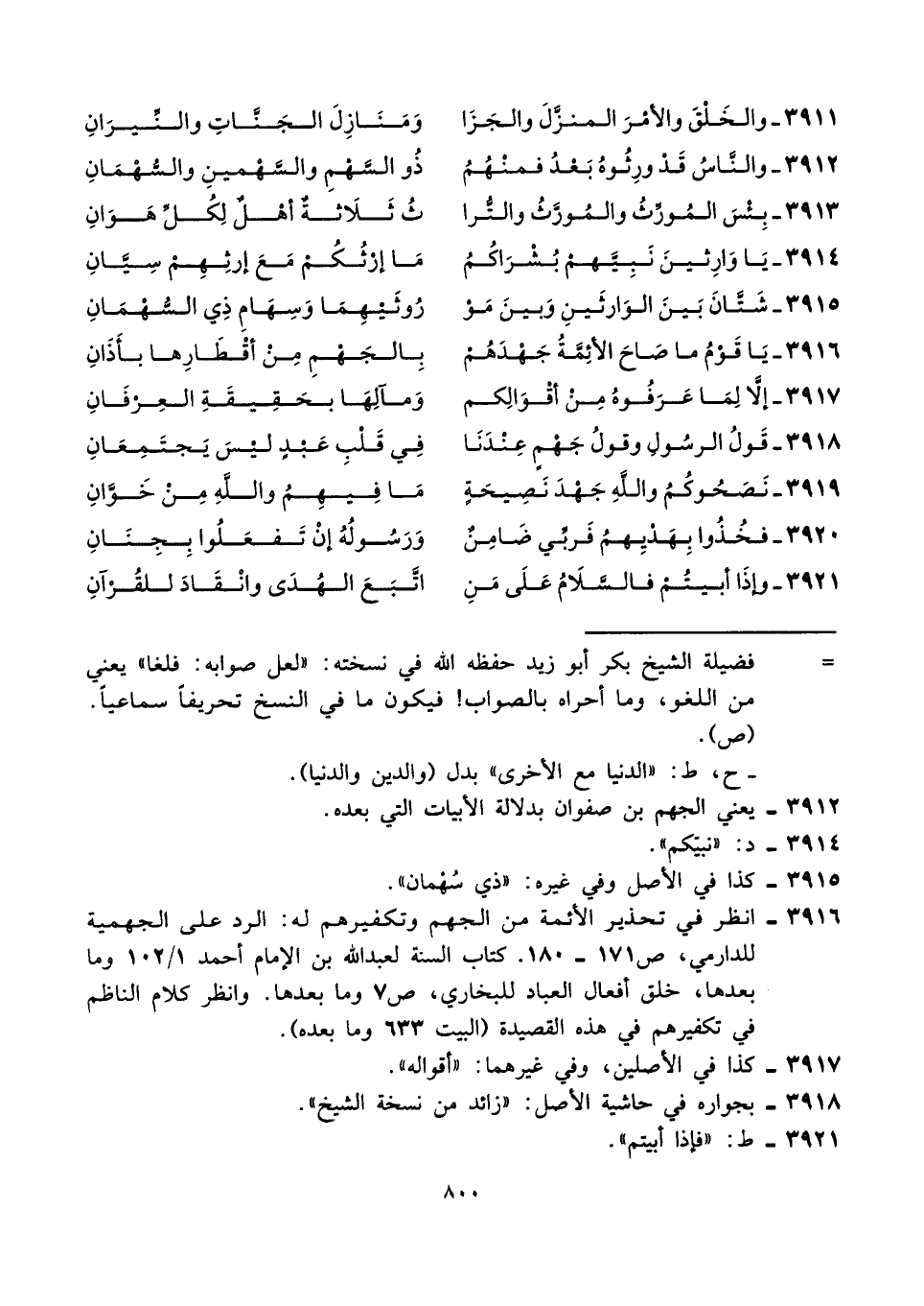 ٣٩١٦ - انظر في تحذير الأئمة من الجهم وتكفيرهم له: الرد على الجهمية للدارمي، ص ١٧١ - ١٨٠. كتاب السنة لعبد الله بن الإمام أحمد ١/ ١٠٢ وما بعدها، خلق أفعال العباد للبخاري، ص ٧ وما بعدها. وانظر كلام الناظم في تكفيرهم في هذه القصيدة (البيت ٦٣٣ وما بعده).