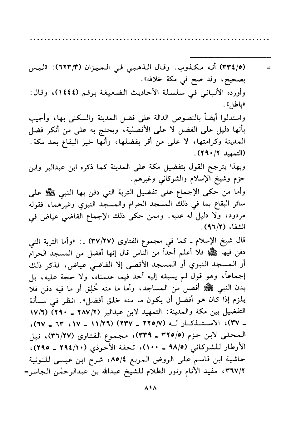 قال شيخ الإسلام -كما في مجموع الفتاوى (٢٧/ ٣٧) -: "وأما التربة التي دفن فيها - صلى الله عليه وسلم - فلا أعلم أحدًا من الناس قال إنها أفضل من المسجد الحرام أو المسجد النبوي أو المسجد الأقصى إلا القاضي عياض، فذكر ذلك إجماعًا، وهو قول لم يسبقه إليه أحد فيما علمناه، ولا حجة عليه، بل بدن النبي - صلى الله عليه وسلم - أفضل من المساجد، وأما ما منه خُلِق أو ما فيه دفن فلا يلزم إذا كان هو أفضل أن يكون ما منه خلق أفضل". انظر في مسألة التفضيل بين مكة والمدينة: التمهيد لابن عبد البر (٢/ ٢٨٧ - ٢٩٠) (٦/ ١٧ - ٣٧)، الاستذكار له (٧/ ٢٢٥ - ٢٣٧) (٢٦/ ١١ - ١٧، ٦٣ - ٦٧)، المحلى لابن حزم (٥/ ٣٢٥ - ٣٣٩)، مجموع الفتاوى (٢٧/ ٣٦)، نيل الأوطار للشوكاني (٥/ ٩٨ - ١٠٠)، تحفة الأحوذي (١٠/ ٢٩٤ - ٢٩٥)، حاشية ابن قاسم على الروض المربع ٤/ ٨٥، شرح ابن عيسى للنونية ٢/ ٣٦٧، مفيد الأنام ونور الظلام للشيخ عبد الله بن عبد الرحمن الجاسر =