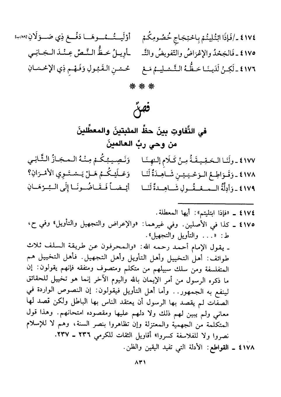٤١٧٥ - كذا في الأصلين. وفي غيرهما: "والإعراض والتجهيل والتأويل" وفي ح، ط: " ... والتأويل والتجهيل".
