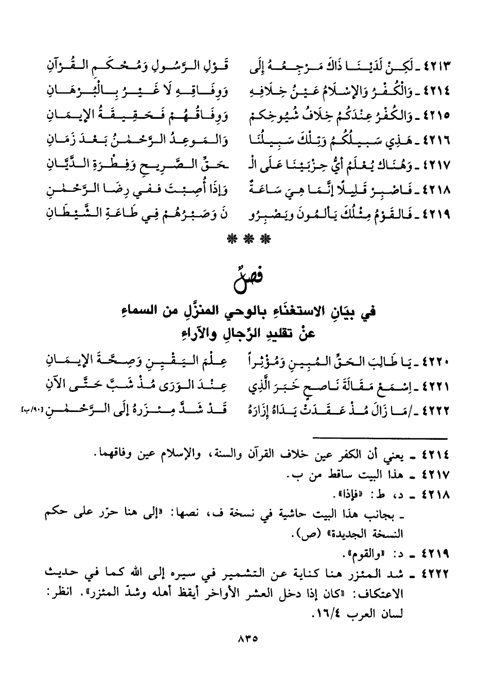 فصلٌ في بيَانِ الاستغنَاءِ بالوحي المنزَّلِ من السماءِ عنْ تقليدِ الرِّجالِ والآراءِ