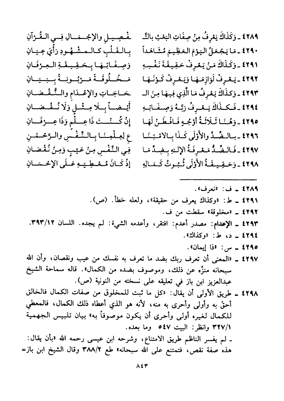 ٤٢٩٧ - "المعنى أن تعرف ربك بضد ما تعرف به نفسك من عيب ونقصان، وأن الله سبحانه منزَّه عن ذلك، وموصوف بضده من الكمال". قاله سماحة الشيخ عبد العزيز ابن باز في تعليقه على نسخته من النونية (ص).