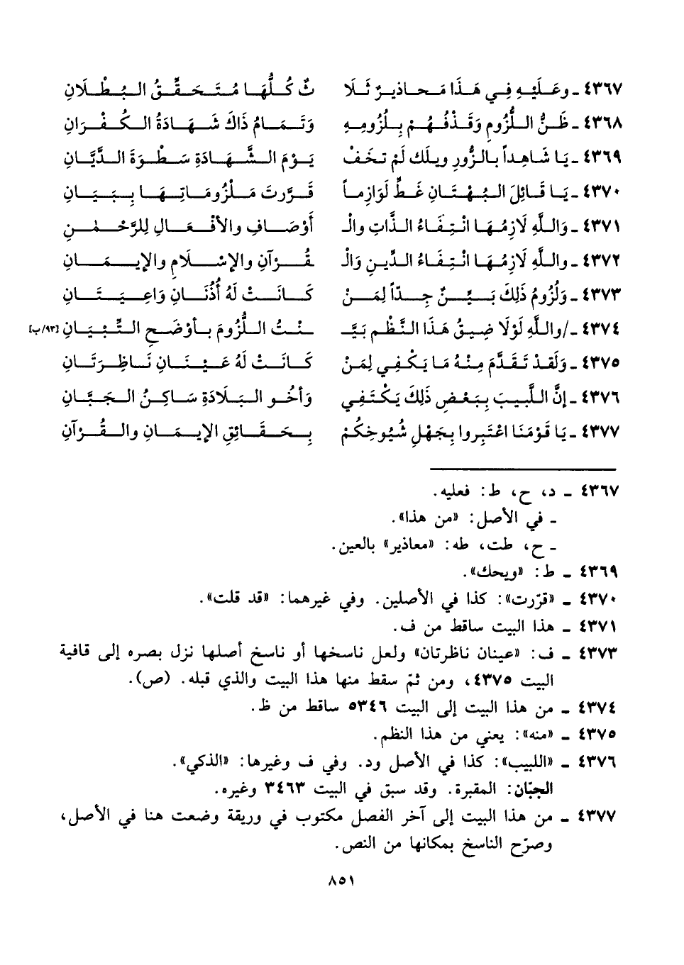 ٤٣٧٣ - ف: "عينان ناظرتان" ولعل ناسخها أو ناسخ أصلها نزل بصره إلى قافية البيت ٤٣٧٥، ومن ثمّ سقط منها هذا البيت والذي قبله. (ص).