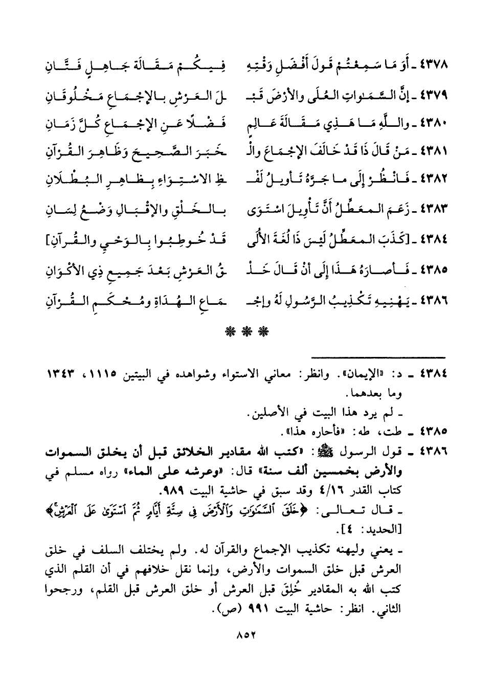 ٤٣٧٩ - إنَّ السَّمَواتِ العُلَى والأرْضَ قَبْـ ... ـلَ العَرْشِ بالإجْمَاعِ مَخْلُوقَانِ