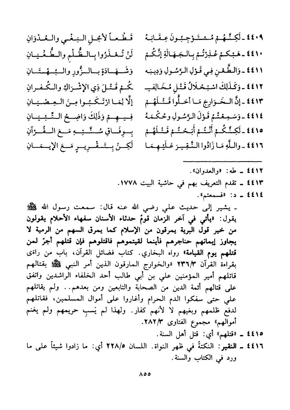 - يشير إلى حديث علي رضي الله عنه قال: سمعت رسول الله - صلى الله عليه وسلم - يقول: "يأتي في آخر الزمان قومٌ حدثاء الأسنان سفهاء الأحلام يقولون من خبر قول البرية يمرقون من الإسلام كما يمرق السهم من الرمية لا يجاوز إيمانهم حناجرهم فأينما لقيتموهم فاقتلوهم فإن قتلهم أجرٌ لمن قتلهم يوم القيامة" رواه البخاري. كتاب فضائل القرآن، باب من راءَى بقراءة القرآن ٣/ ٢٣٦ "والخوارج المارقون الذين أمر النبي - صلى الله عليه وسلم - بقتالهم قاتلهم أمير المؤمنين علي بن أبي طالب أحد الخلفاء الراشدين واتفق على قتالهم أئمة الدين من الصحابة والتابعين ومن بعدهم .. ولم يقاتلهم علي حتى سفكوا الدم الحرام وأغاروا على أموال المسلمين، فقاتلهم لدفع ظلمهم وبغيهم لا لأنهم كفار. ولهذا لم يَسبِ حريمهم ولم يغنم أموالهم" مجموع الفتاوى ٣/ ٢٨٢.
