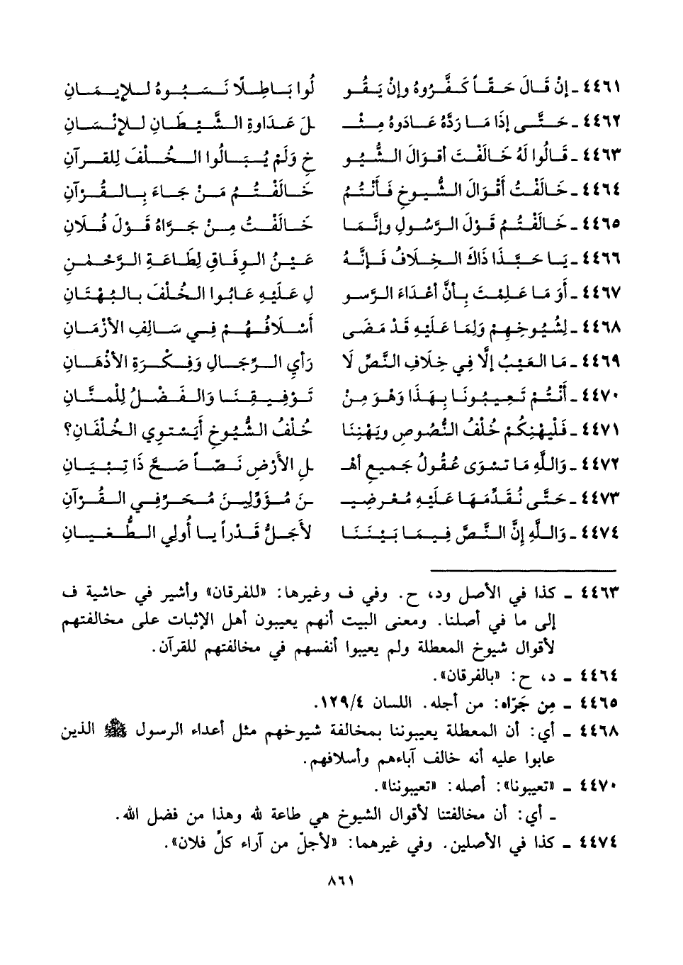 ٤٤٧٣ - حَتَّى نُقَدِّمَهَا عَلَيْهِ مُعْرضِيـ ... ـنَ مُؤَوِّلِينَ مُحَرِّفِي القُرْآنِ