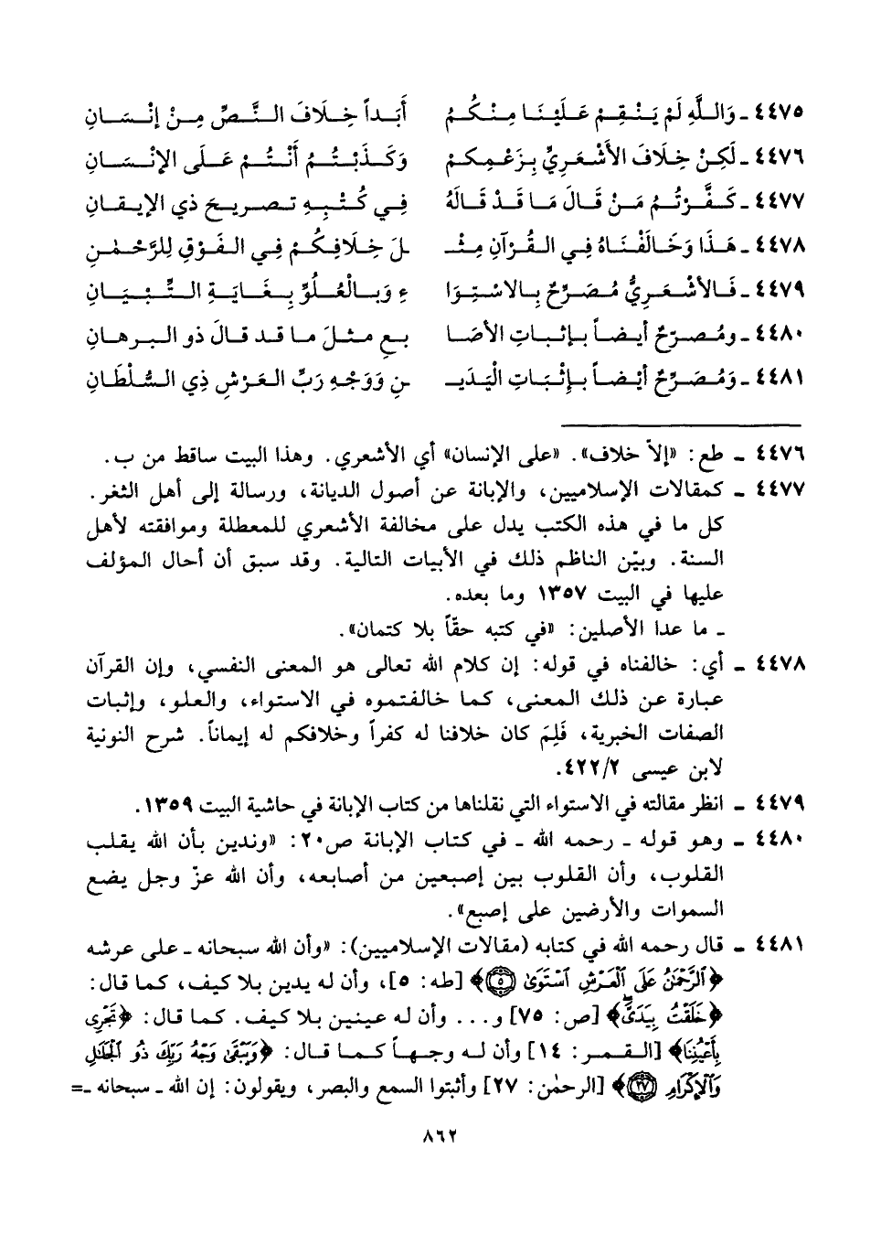 ٤٤٧٧ - كمقالات الإسلاميين، والإبانة عن أصول الديانة، ورسالة إلى أهل الثغر. كل ما في هذه الكتب يدل على مخالفة الأشعري للمعطلة وموافقته لأهل السنة. وبيّن الناظم ذلك في الأبيات التالية. وقد سبق أن أحال المؤلف عليها في البيت ١٣٥٧ وما بعده.