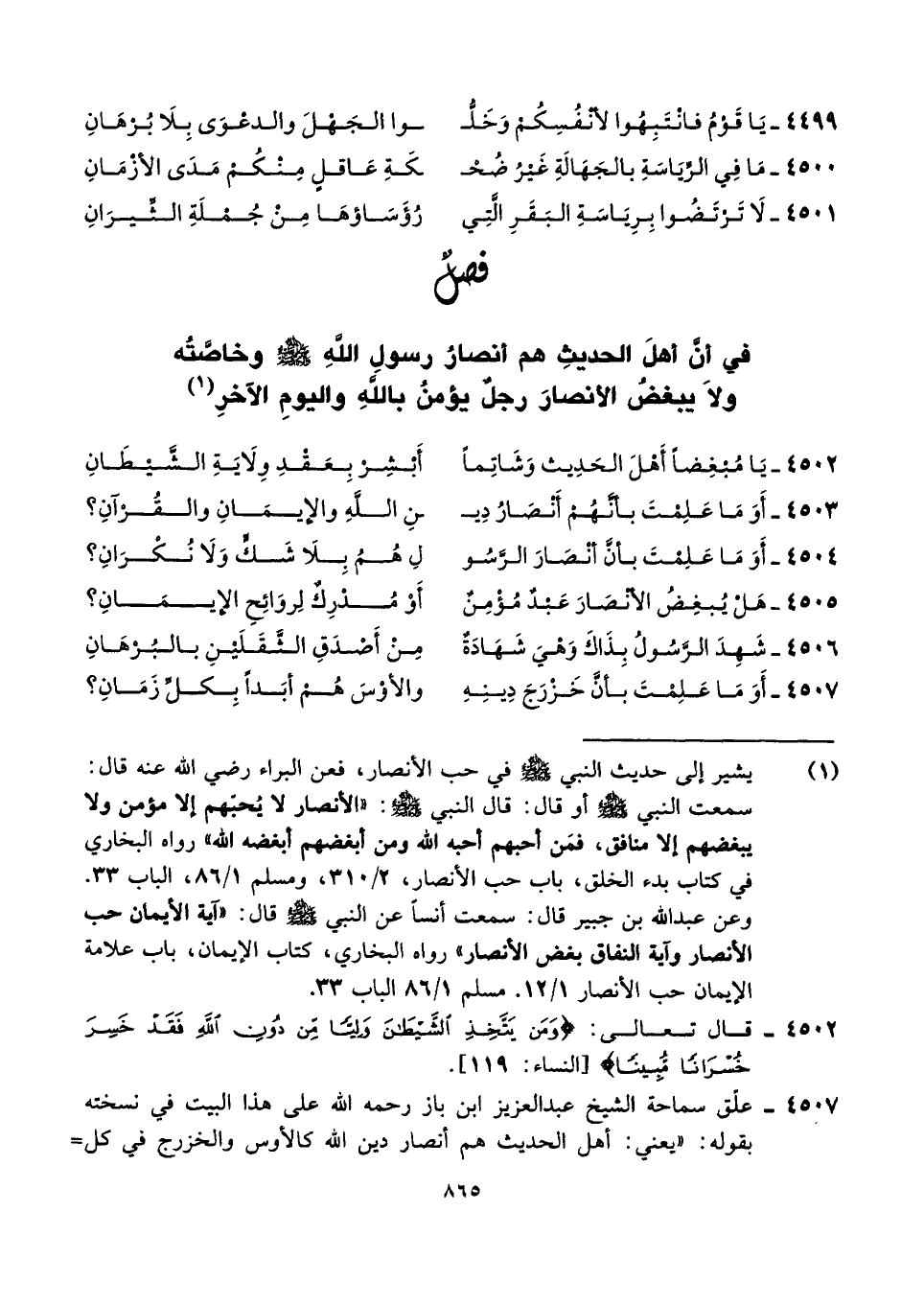 ٤٥٠٧ - علّق سماحة الشيخ عبد العزيز ابن باز رحمه الله على هذا البيت في نسخته بقوله: "يعني: أهل الحديث هم أنصار دين الله كالأوس والخزرج في كل =