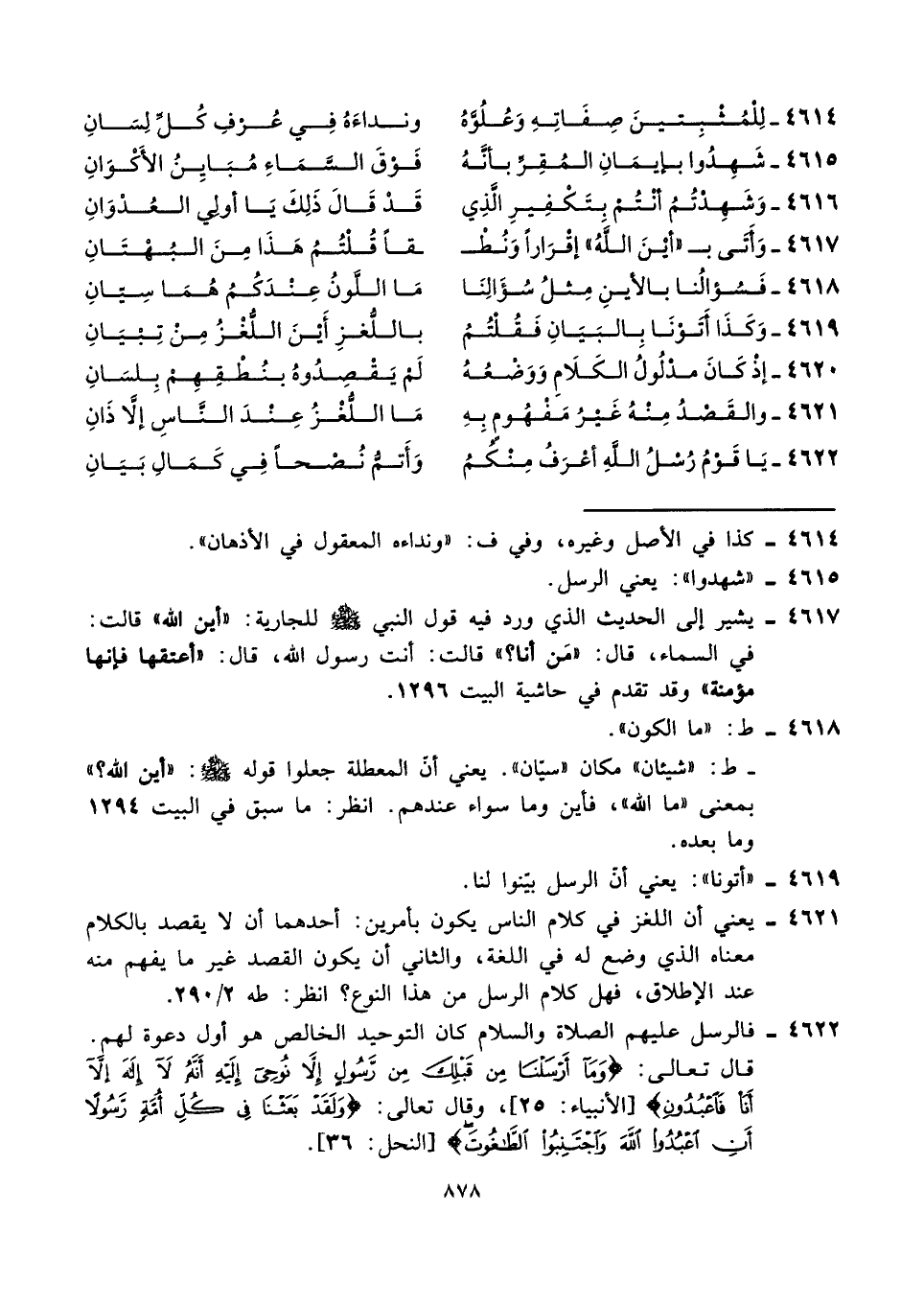٤٦١٧ - يشير إلى الحديث الذي ورد فيه قول النبي - صلى الله عليه وسلم - للجارية: "أين الله" قالت: في السماء، قال: "مَن أنا؟ " قالت: أنت رسول الله، قال: "أعتقها فإنها مؤمنة" وقد تقدم في حاشية البيت ١٢٩٦.