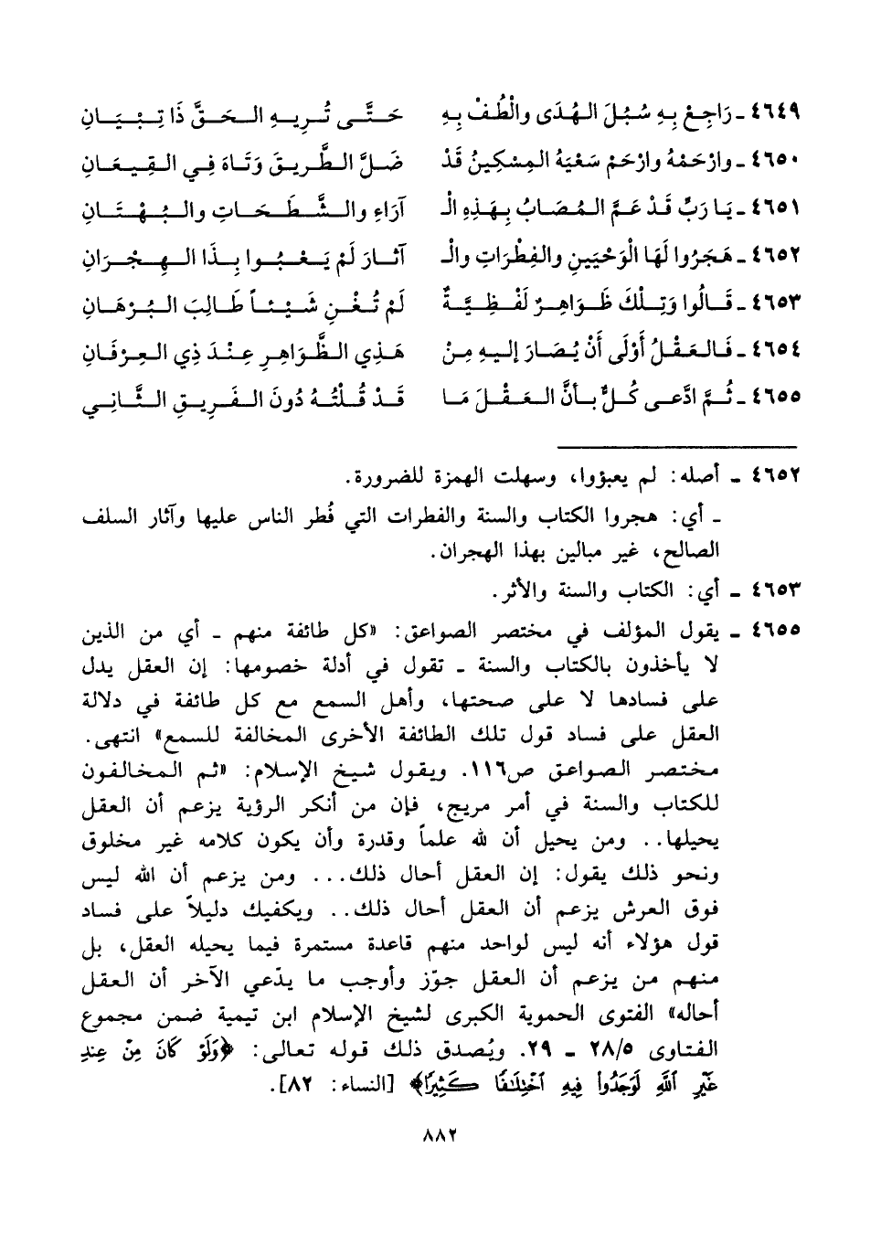 ٤٦٥٥ - يقول المؤلف في مختصر الصواعق: "كل طائفة منهم -أي من الذين لا يأخذون بالكتاب والسنة- تقول في أدلة خصومها: إن العقل يدل على فسادها لا على صحتها، وأهل السمع مع كل طائفة في دلالة العقل على فساد قول تلك الطائفة الأخرى المخالفة للسمع" انتهى. مختصر الصواعق ص ١١٦. ويقول شيخ الإسلام: "ثم المخالفون للكتاب والسنة في أمر مريج، فإن من أنكر الرؤية يزعم أن العقل يحيلها .. ومن يحيل أن لله علمًا وقدرة وأن يكون كلامه غير مخلوق ونحو ذلك يقول: إن العقل أحال ذلك ... ومن يزعم أن الله ليس فوق العرش يزعم أن العقل أحال ذلك .. ويكفيك دليلًا على فساد قول هؤلاء أنه ليس لواحد منهم قاعدة مستمرة فيما يحيله العقل، بل منهم من يزعم أن العقل جوّز وأوجب ما يدّعي الآخر أن العقل أحاله" الفتوى الحموية الكبرى لشيخ الإسلام ابن تيمية ضمن مجموع الفتاوى ٥/ ٢٨ - ٢٩. ويُصدق ذلك قوله تعالى: {وَلَوْ كَانَ مِنْ عِنْدِ غَيْرِ اللهِ لَوَجَدُوا فِيهِ اخْتِلَافًا كَثِيرًا} [النساء: ٨٢].