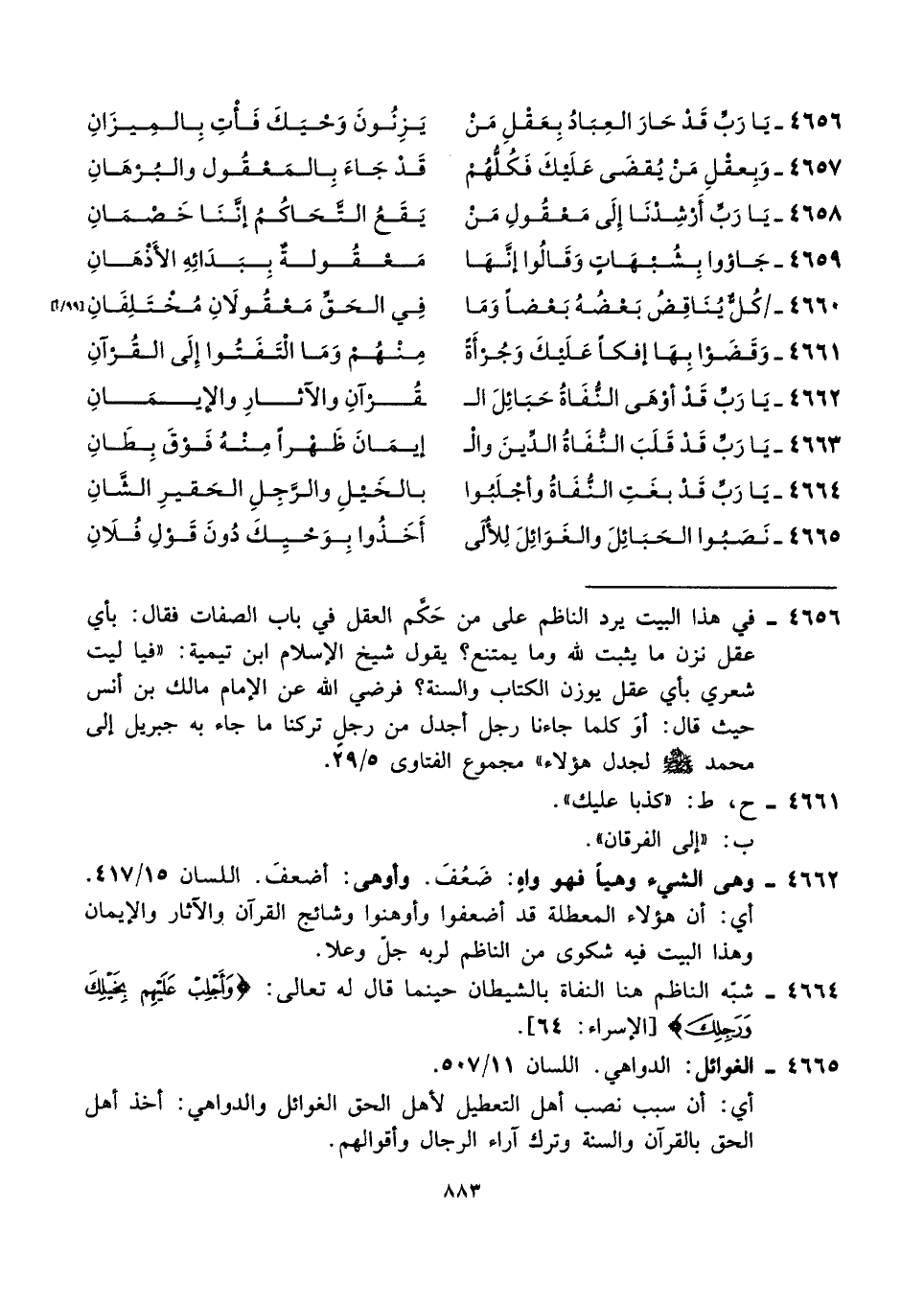 ٤٦٥٦ - في هذا البيت يرد الناظم على من حَكَّم العقل في باب الصفات فقال: بأي عقل نزن ما يثبت لله وما يمتنع؟ يقول شيخ الإسلام ابن تيمية: "فيا ليت شعري بأي عقل يوزن الكتاب والسنة؟ فرضي الله عن الإمام مالك بن أنس حيث قال: أوَ كلما جاءنا رجل أجدل من رجلٍ تركنا ما جاء به جبريل إلى محمد - صلى الله عليه وسلم - لجدل هؤلاء" مجموع الفتاوى ٥/ ٢٩.