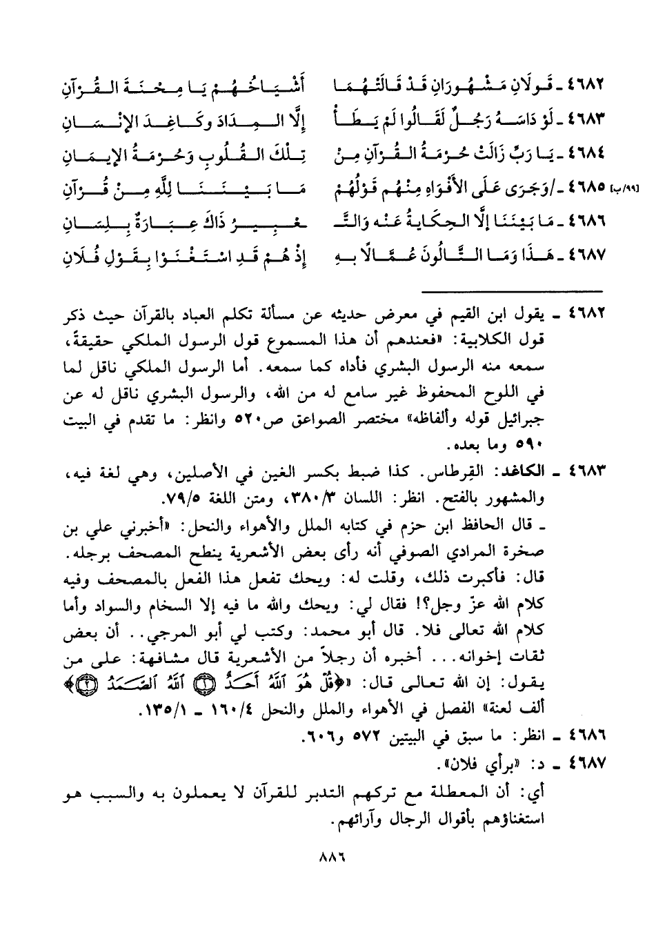 ٤٦٨٢ - يقول ابن القيم في معرض حديثه عن مسألة تكلم العباد بالقرآن حيث ذكر قول الكلابية: "فعندهم أن هذا المسموع قول الرسول الملكي حقيقةً، سمعه منه الرسول البشري فأداه كما سمعه. أما الرسول الملكي ناقل لما في اللوح المحفوظ غير سامع له من الله، والرسول البشري ناقل له عن جبرائيل قوله وألفاظه" مختصر الصواعق ص ٥٢٠ وانظر: ما تقدم في البيت ٥٩٠ وما بعده.