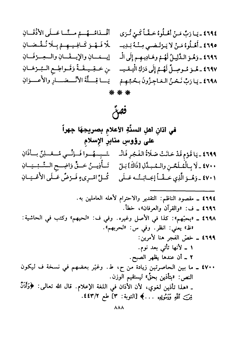 فصلٌ في أذانِ أهلِ السنَّةِ الأعلامِ بصريحِهَا جهرًا على رؤوسِ منابرِ الإِسلامِ