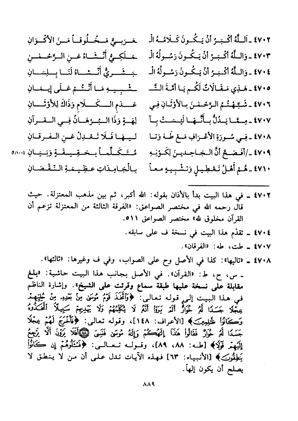 ٤٧٠٢ - في هذا البيت بدأ بالأذان بقوله: الله أكبر، ثم بين مذهب المعتزلة. حيث قال رحمه الله في مختصر الصواعق: "الفرقة الثالثة من المعتزلة تزعم أن القرآن مخلوق لله" مختصر الصواعق ٥١١.
