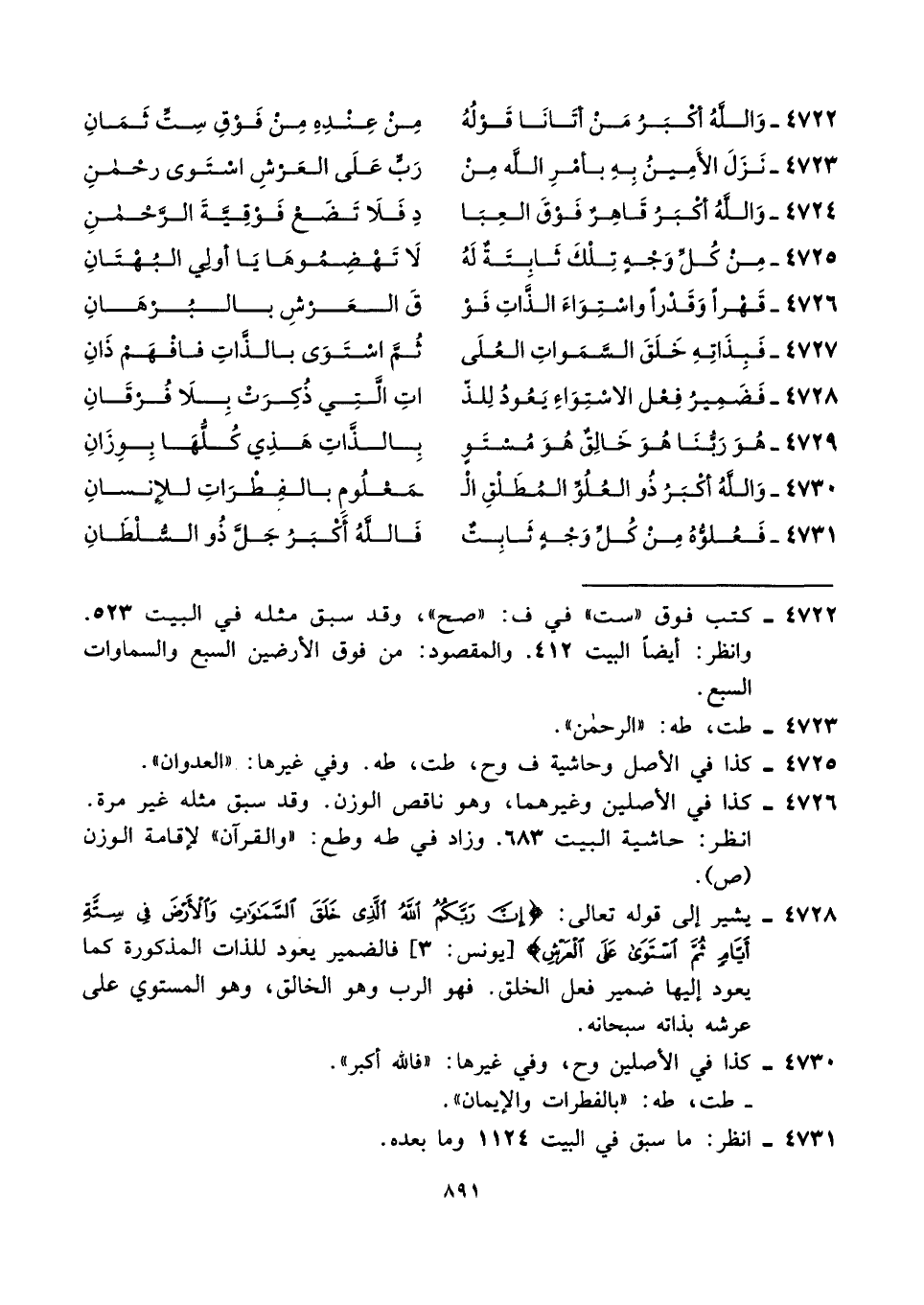 ٤٧٢٨ - يشير إلى قوله تعالى: {إِنَّ رَبَّكُمُ اللَّهُ الَّذِي خَلَقَ السَّمَاوَاتِ وَالْأَرْضَ فِي سِتَّةِ أَيَّامٍ ثُمَّ اسْتَوَى عَلَى الْعَرْشِ} [يونس: ٣] فالضمير يعود للذات المذكورة كما يعود إليها ضمير فعل الخلق. فهو الرب وهو الخالق، وهو المستوي على عرشه بذاته سبحانه.