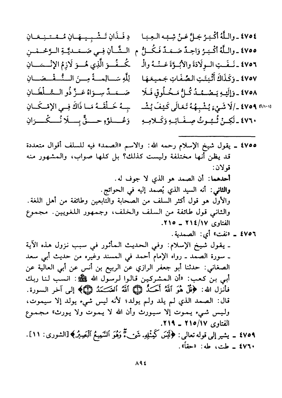 ٤٧٥٥ - يقول شيخ الإسلام رحمه الله: والاسم "الصمد" فيه للسلف أقوال متعددة قد يظن أنها مختلفة وليست كذلك؟ بل كلها صواب، والمشهور منه قولان: