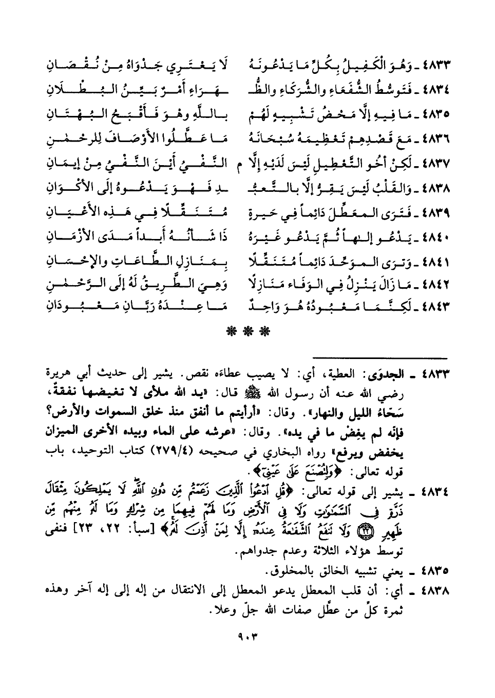 ٤٨٣٤ - يشير إلى قوله تعالى: {قُلِ ادْعُوا الَّذِينَ زَعَمْتُمْ مِنْ دُونِ اللهِ لَا يَمْلِكُونَ مِثْقَالَ ذَرَّةٍ فِي السَّمَاوَاتِ وَلَا فِي الْأَرْضِ وَمَا لَهُمْ فِيهِمَا مِنْ شِرْكٍ وَمَا لَهُ مِنْهُمْ مِنْ ظَهِيرٍ (٢٢) وَلَا تَنْفَعُ الشَّفَاعَةُ عِنْدَهُ إِلَّا لِمَنْ أَذِنَ لَهُ} [سبأ: ٢٢، ٢٣] فنفى توسط هؤلاء الثلاثة وعدم جدواهم.