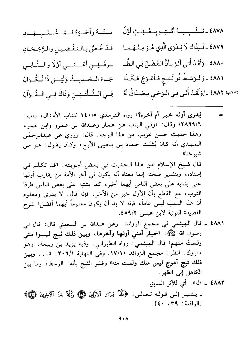 ٤٨٧٨ - تَشْبِيهُ أمَّتِهِ بِغَيْثٍ أوَّلٌ ... مِنْهُ وآخِرُهُ فمُشْتَبِهَانِ