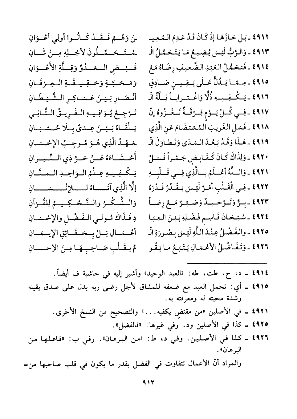 ٤٩٢٦ - وَتَفَاضُلُ الأعْمَالِ يَتْبَعُ ما يَقُو ... مُ بقَلْبِ صَاحِبِهَا مِنَ الإحسانِ