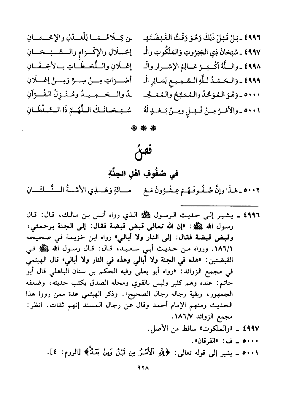 ٤٩٩٦ - يشير إلى حديث الرسول - صلى الله عليه وسلم - الذي رواه أنس بن مالك، قال: قال رسول الله - صلى الله عليه وسلم -: "إن الله تعالى قبض قبضة فقال: إلى الجنة برحمتي، وقبض قبضة فقال: إلى النار ولا أبالي" رواه ابن خزيمة في صحيحه ١/ ١٨٦. ورواه من حديث أبي سعيد، قال: قال رسول الله - صلى الله عليه وسلم - في القبضتين: "هذه في الجنة ولا أبالي وهذه في النار ولا أبالي" قال الهيثمي في مجمع الزوائد: "رواه أبو يعلى وفيه الحكم بن سنان الباهلي قال أبو حاتم: عنده وهم كثير وليس بالقوي ومحله الصدق يكتب حديثه، وضعفه الجمهور، وبقية رجاله رجال الصحيح". وذكر الهيثمي عدة ممن رووا هذا الحديث ومنهم الإمام أحمد وقال عن رجال المسند إنهم ثقات. انظر: مجمع الزوائد ٧/ ١٨٦.
