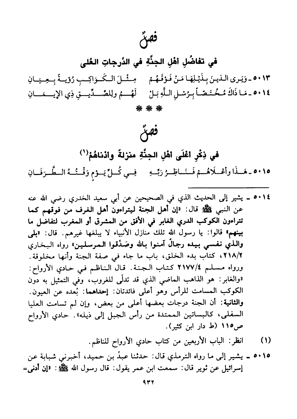 ٥٠١٤ - يشير إلى الحديث الذي في الصحيحين عن أبي سعيد الخدري رضي الله عنه عن النبي - صلى الله عليه وسلم - قال: "إن أهل الجنة ليتراءون أهل الغرف من فوقهم كما تتراءون الكوكب الدري الغابر في الأفق من المشرق أو المغرب لتفاضل ما بينهم" قالوا: يا رسول الله تلك منازل الأنبياء لا يبلغها غيرهم. قال: "بلى والذي نفسي بيده رجالٌ آمنوا بالله وصَدَّقوا المرسلين" رواه البخاري ٢/ ٢١٨، كتاب بدء الخلق، باب ما جاء في صفة الجنة وأنها مخلوقة. ورواه مسلم ٤/ ٢١٧٧ كتاب الجنة. قال الناظم في حادي الأرواح: "والغابر: هو الذاهب الماضي الذي قد تدلى للغروب، وفي التمثيل به دون الكوكب المسامت للرأس وهو أعلى فائدتان: إحداهما: بُعده عن العيون. والثانية: أن الجنة درجات بعضها أعلى من بعض، وإن لم تسامت العليا السفلى، كالبساتين الممتدة من رأس الجبل إلى ذيله". حادي الأرواح ص ١١٥ (ط دار ابن كثير).