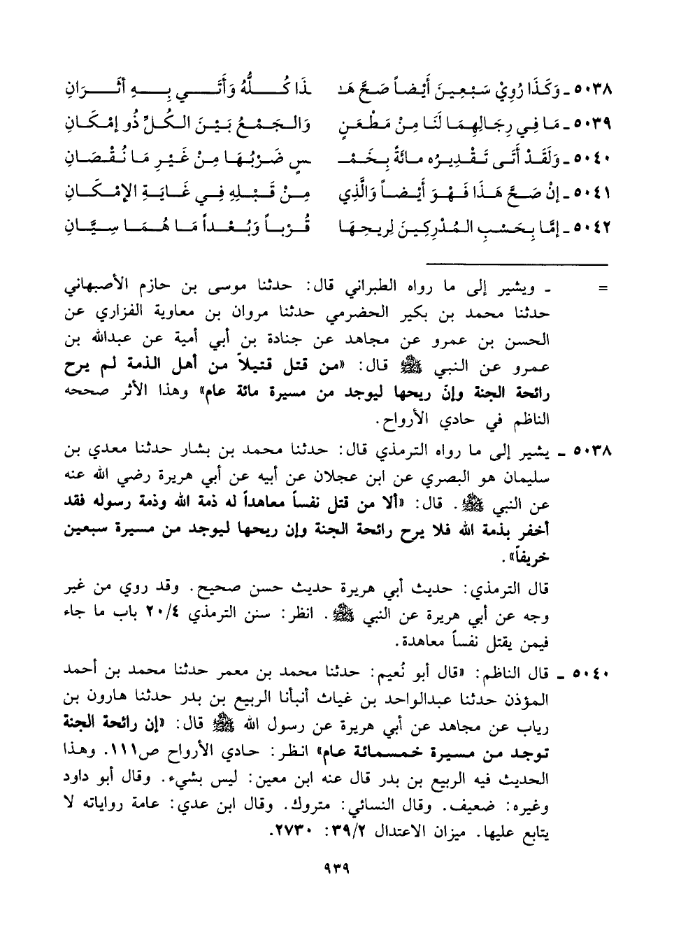 ٥٠٣٨ - يشير إلى ما رواه الترمذي قال: حدثنا محمد بن بشار حدثنا معدي بن سليمان هو البصري عن ابن عجلان عن أبيه عن أبي هريرة رضي الله عنه عن النبي - صلى الله عليه وسلم -. قال: "ألا من قتل نفسًا معاهدًا له ذمة الله وذمة رسوله فقد أخفر بذمة الله فلا يرح رائحة الجنة وإن ريحها ليوجد من مسيرة سبعين خريفًا".