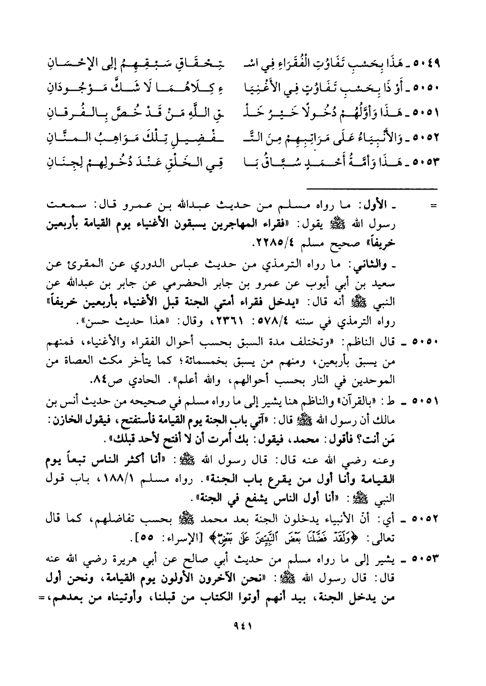 ٥٠٥٠ - قال الناظم: "وتختلف مدة السبق بحسب أحوال الفقراء والأغنياء، فمنهم من يسبق بأربعين، ومنهم من يسبق بخمسمائة؛ كما يتأخر مكث العصاة من الموحدين في النار بحسب أحوالهم، والله أعلم". الحادي ص ٨٤.