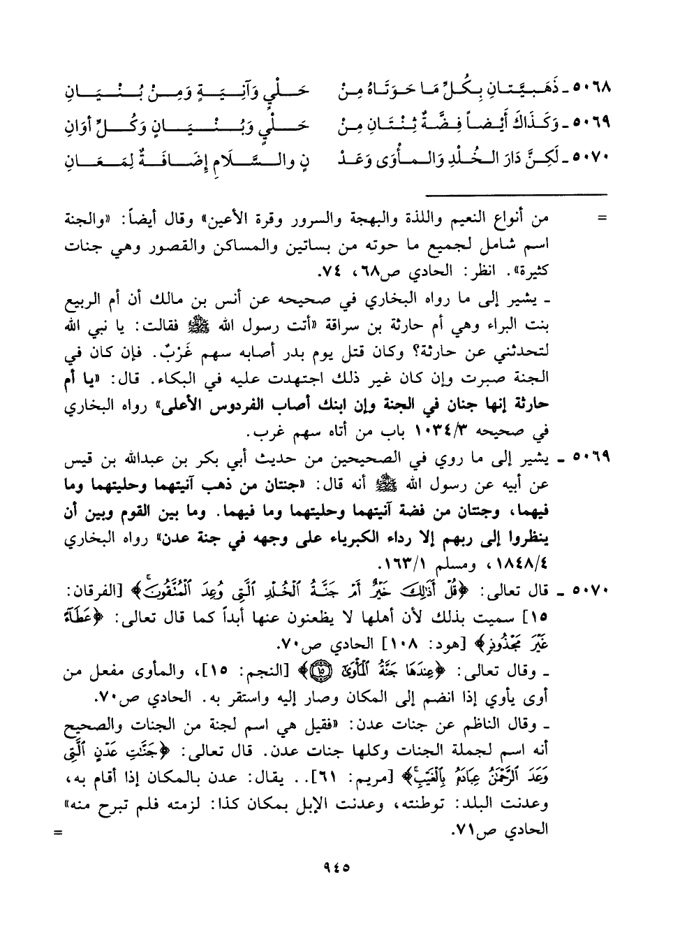 ٥٠٦٩ - يشير إلى ما روي في الصحيحين من حديث أبي بكر بن عبد الله بن قيس عن أبيه عن رسول الله - صلى الله عليه وسلم - أنه قال: "جنتان من ذهب آنيتهما وحليتهما وما فيهما، وجنتان من فضة آنيتهما وحليتهما وما فيهما. وما بين القوم وبين أن ينظروا إلى ربهم إلا رداء الكبرياء على وجهه في جنة عدن" رواه البخاري ٤/ ١٨٤٨، ومسلم ١/ ١٦٣.