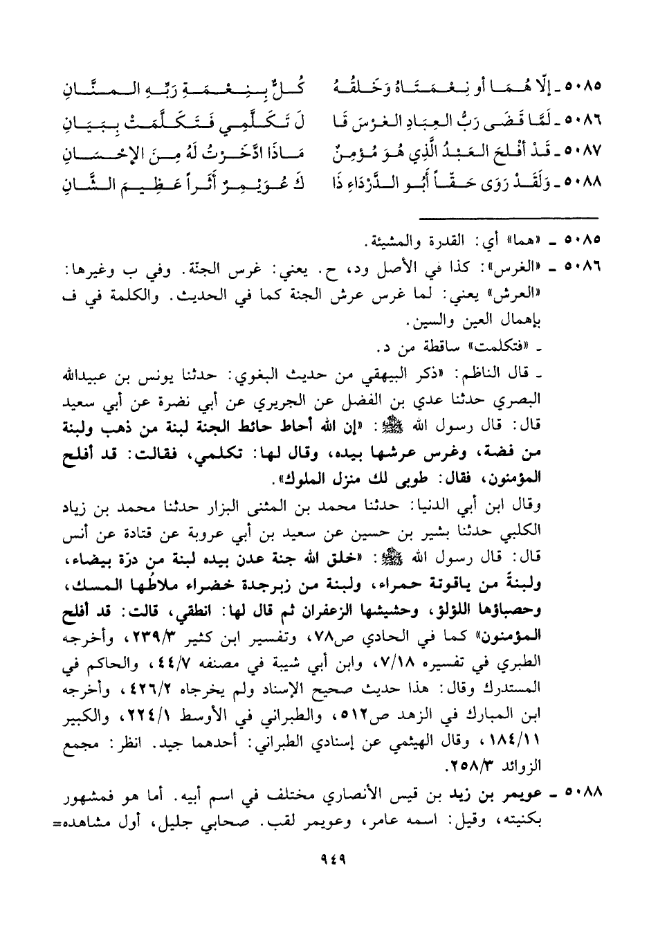 - قال الناظم: "ذكر البيهقي من حديث البغوي: حدثنا يونس بن عبيد الله البصري حدثنا عدي بن الفضل عن الجريري عن أبي نضرة عن أبي سعيد قال: قال رسول الله - صلى الله عليه وسلم -: "إن الله أحاط حائط الجنة لبنة من ذهب ولبنة من فضة، وغرس عرشها بيده، وقال لها: تكلمي، فقالت: قد أفلح المؤمنون، فقال: طوبى لك منزل الملوك".