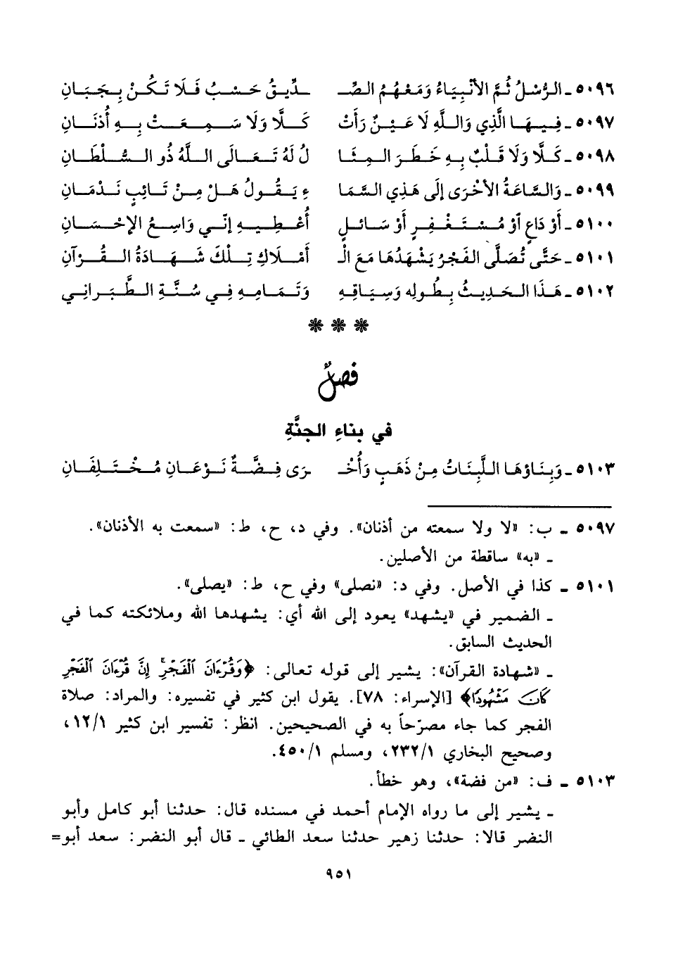 - "شهادة القرآن": يشير إلى قوله تعالى: {وَقُرْآنَ الْفَجْرِ إِنَّ قُرْآنَ الْفَجْرِ كَانَ مَشْهُودًا} [الإسراء: ٧٨]. يقول ابن كثير في تفسيره: والمراد: صلاة الفجر كما جاء مصرّحًا به في الصحيحين. انظر: تفسير ابن كثير ١/ ١٢، وصحيح البخاري ١/ ٢٣٢، ومسلم ١/ ٤٥٠.