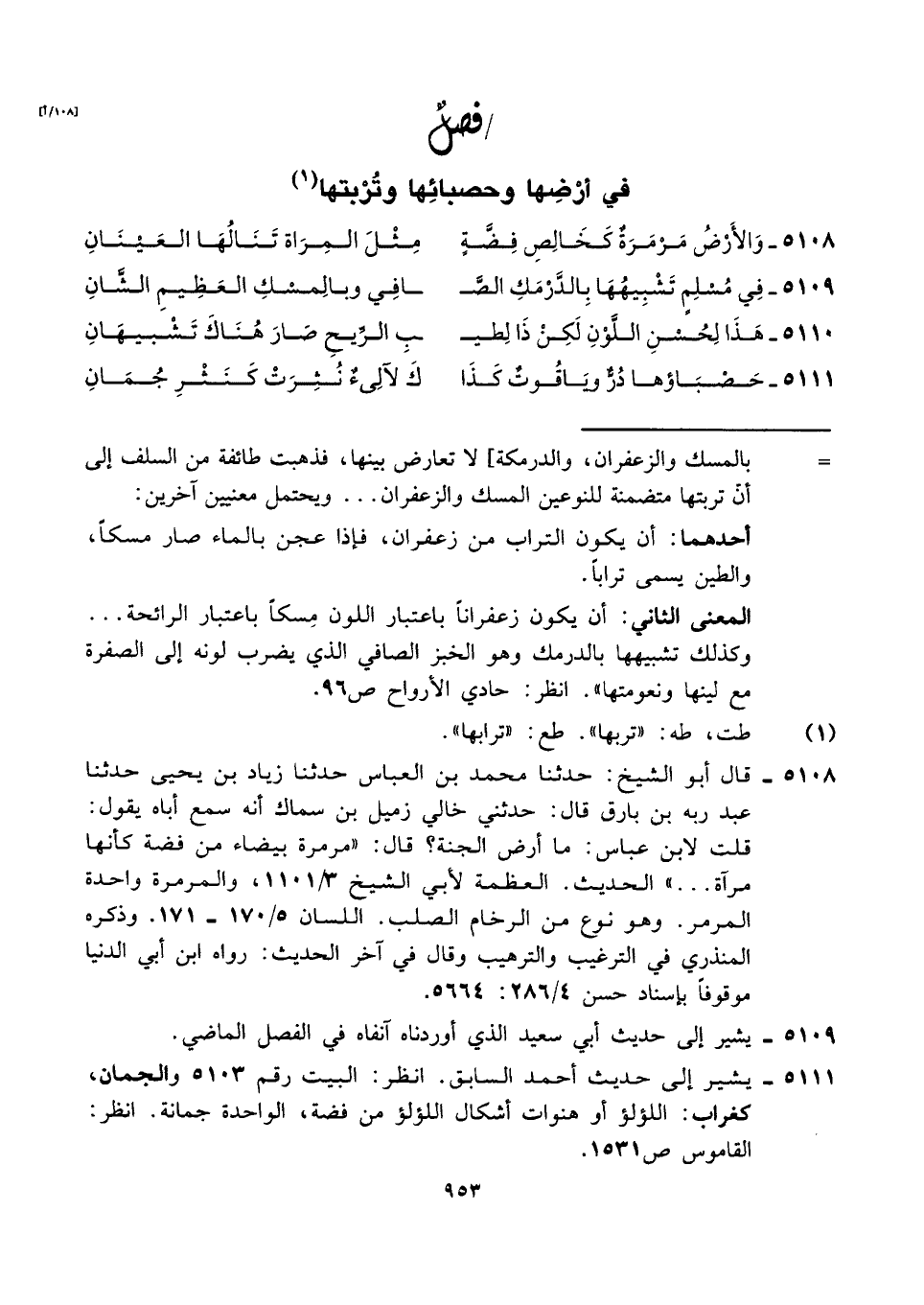 ٥١٠٨ - وَالأَرْضُ مَرْمَرَةٌ كَخَالِصِ فِضَّةٍ ... مِثْلَ المِرَاة تَنَالُهَا العَيْنَانِ
