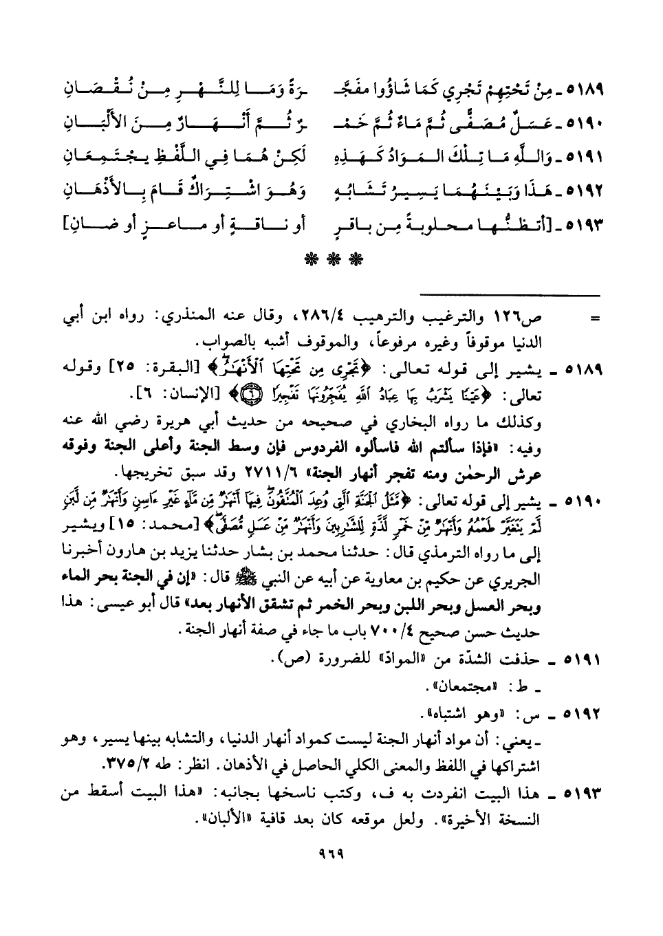 ٥١٨٩ - يشير إلى قوله تعالى: {تَجْرِي مِنْ تَحْتِهَا الْأَنْهَارُ} [البقرة: ٢٥] وقوله تعالى: {عَيْنًا يَشْرَبُ بِهَا عِبَادُ اللهِ يُفَجِّرُونَهَا تَفْجِيرًا (٦)} [الإنسان: ٦].