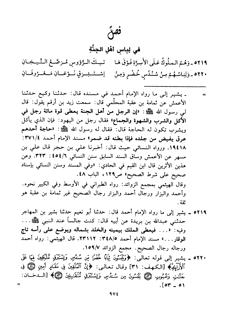 ٥٢٢٠ - يشير إلى قوله تعالى: {وَيَلْبَسُونَ ثِيَابًا خُضْرًا مِنْ سُنْدُسٍ وَإِسْتَبْرَقٍ مُتَّكِئِينَ فِيهَا عَلَى الْأَرَائِكِ} [الكهف: ٣١]، وقال تعالى: {إِنَّ الْمُتَّقِينَ فِي مَقَامٍ أَمِينٍ (٥١) فِي جَنَّاتٍ وَعُيُونٍ (٥٢) يَلْبَسُونَ مِنْ سُنْدُسٍ وَإِسْتَبْرَقٍ مُتَقَابِلِينَ (٥٣)} [الدخان: ٥١ - ٥٣]. =