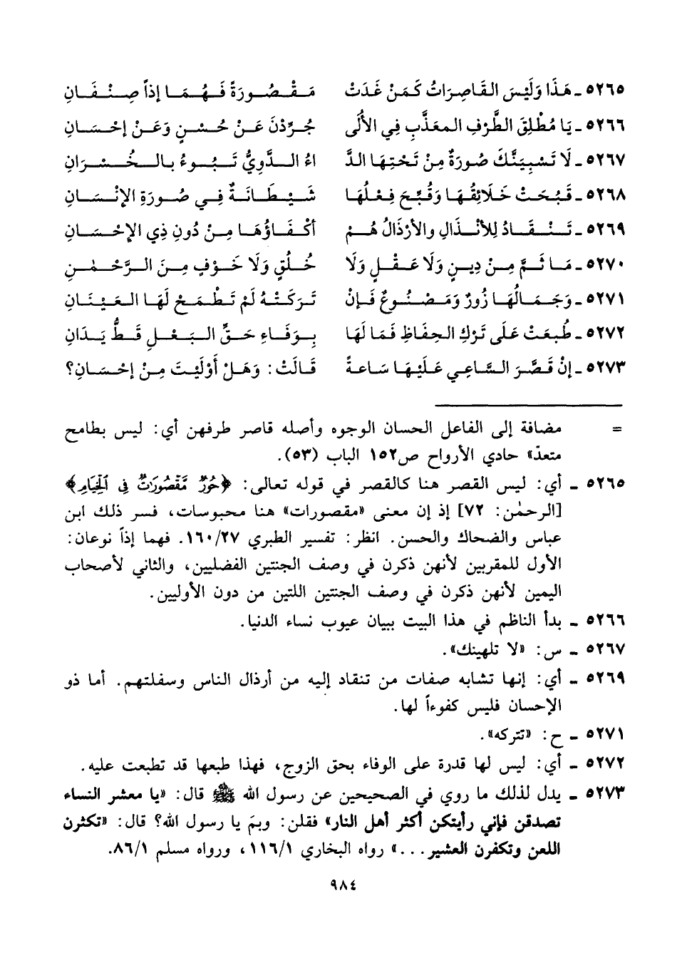 ٥٢٦٥ - هَذَا وَلَيْسَ القَاصِرَاتُ كَمَنْ غَدَتْ ... مَقْصُورَةً فَهُمَا إذًا صِنْفَانِ
