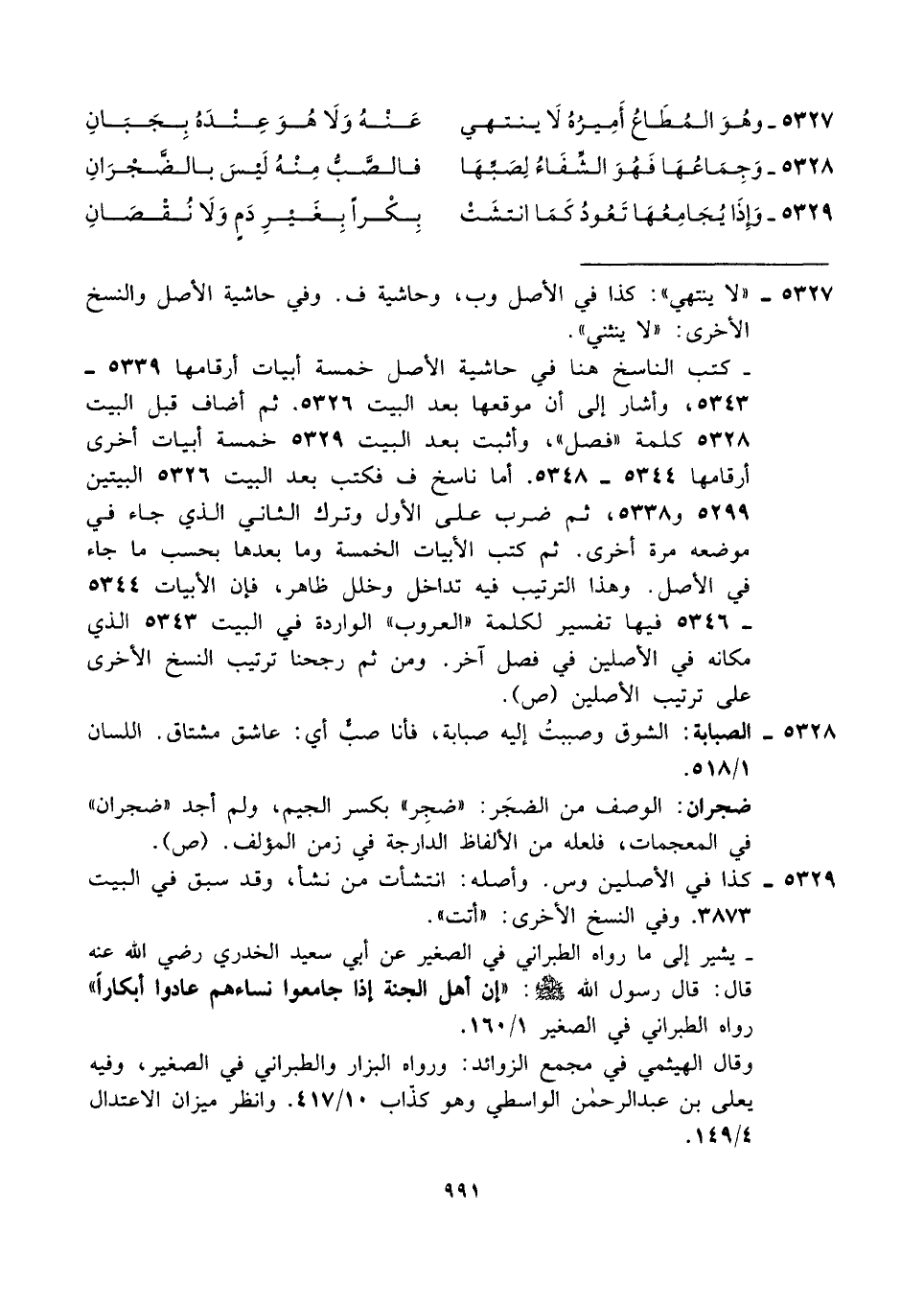 - كتب الناسخ هنا في حاشية الأصل خمسة أبيات أرقامها ٥٣٣٩ - ٥٣٤٣، وأشار إلى أن موقعها بعد البيت ٥٣٢٦. ثم أضاف قبل البيت ٥٣٢٨ كلمة "فصل"، وأثبت بعد البيت ٥٣٢٩ خمسة أبيات أخرى أرقامها ٥٣٤٤ - ٥٣٤٨. أما ناسخ ف فكتب بعد البيت ٥٣٢٦ البيتين ٥٢٩٩ و ٥٣٣٨، ثم ضرب على الأول وترك الثاني الذي جاء في موضعه مرة أخرى. ثم كتب الأبيات الخمسة وما بعدها بحسب ما جاء في الأصل. وهذا الترتيب فيه تداخل وخلل ظاهر، فإن الأبيات ٥٣٤٤ - ٥٣٤٦ فيها تفسير لكلمة "العروب" الواردة في البيت ٥٣٤٣ الذي مكانه في الأصلين في فصل آخر. ومن ثم رجحنا ترتيب النسخ الأخرى على ترتيب الأصلين (ص).