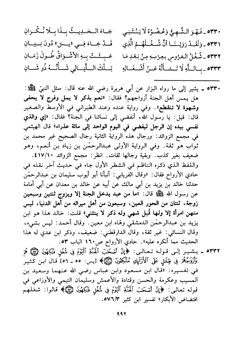 ٥٣٣٢ - يشير إلى قوله تعالى: {إِنَّ أَصْحَابَ الْجَنَّةِ الْيَوْمَ فِي شُغُلٍ فَاكِهُونَ (٥٥) هُمْ وَأَزْوَاجُهُمْ فِي ظِلَالٍ عَلَى الْأَرَائِكِ مُتَّكِئُونَ (٥٦)} [يس: ٥٥ - ٥٦]، قال ابن كثير في تفسيره: "قال ابن مسعود وابن عباس رضي الله عنهما وسعيد بن المسيب وعكرمة والحسن وقتادة والأعمش وسليمان التيمي والأوزاعي في قوله تعالى: {إِنَّ أَصْحَابَ الْجَنَّةِ الْيَوْمَ فِي شُغُلٍ فَاكِهُونَ (٥٥)} قالوا: شغلهم افتضاض الأبكار" تفسير ابن كثير ٣/ ٥٧٦.