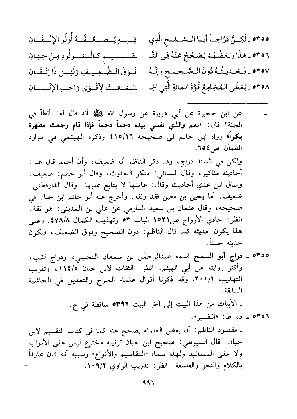 ٥٣٥٥ - لَكِنَّ دَرَّاجًا أبَا السَّمْحِ الَّذِي ... فِيهِ يُضَعِّفُهُ أُولُو الإِتْقَانِ