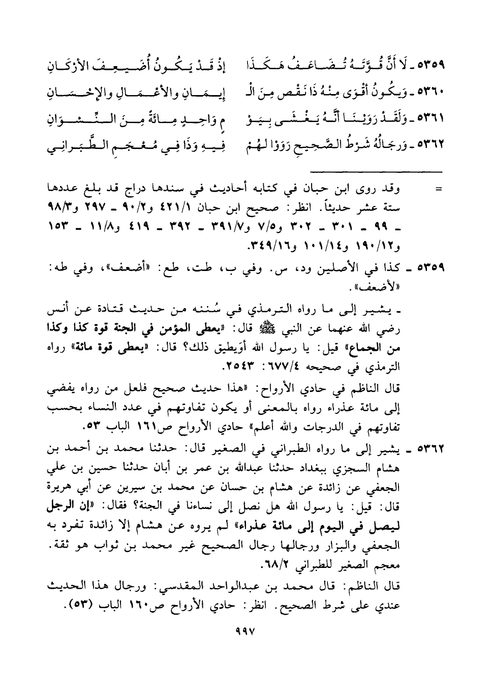 ٥٣٦٠ - وَيكُونُ أقْوَى مِنْهُ ذَا نَقْص مِنَ الْـ ... إِيمَانِ والأعْمَالِ والإِحْسَانِ