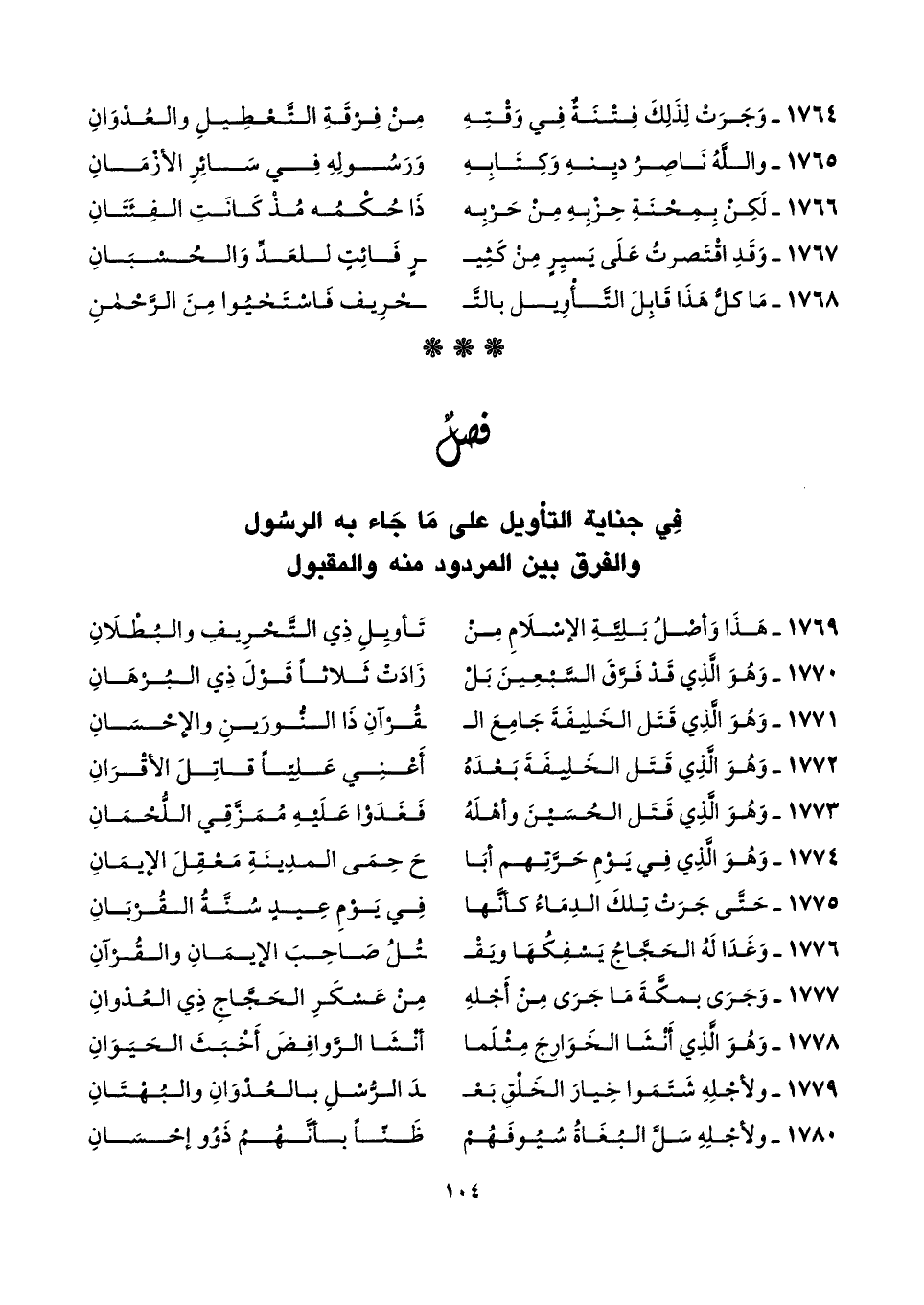 ١٧٦٩ - هَذَا وَأصْلُ بَلِيَّةِ الإسْلَامِ مِنْ ... تَأويِلِ ذِي التَّحْرِيفِ والبُطْلَانِ
