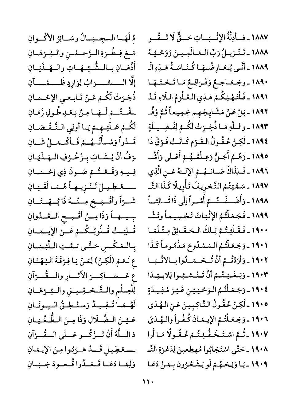 ١٨٩١ - فَلْتَهْنِكُمْ هَذِي العُلُومُ اللّاءِ قَدْ ... ذُخِرَتْ لَكُمْ عَنْ تَابعي الإحْسَانِ