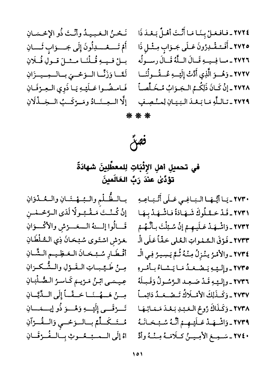 ٢٧٣٩ - وَاشْهَدْ عَلَيْهِمْ أنَّهُ سُبْحَانَهُ ... مُتَكَلِّمٌ بالوَحْيِ وَالقُرْآنِ