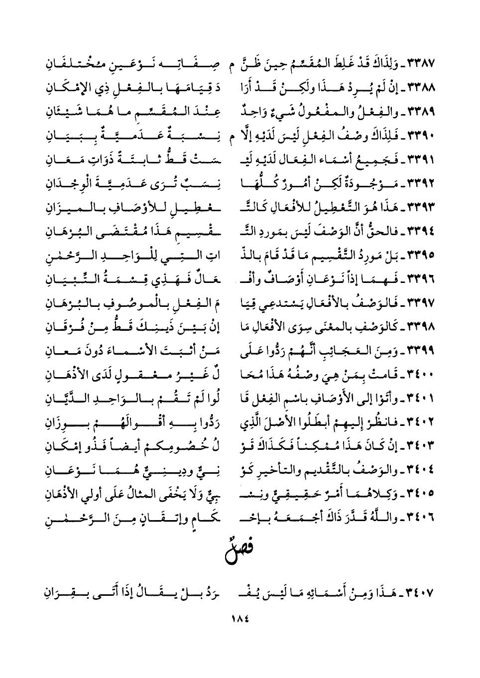 ٣٣٩٤ - فالحقُّ أنَّ الوَصْفَ لَيْسَ بمَوردِ التَّـ ... ـقْسِيمِ هذَا مُقْتَضَى البُرْهَانِ