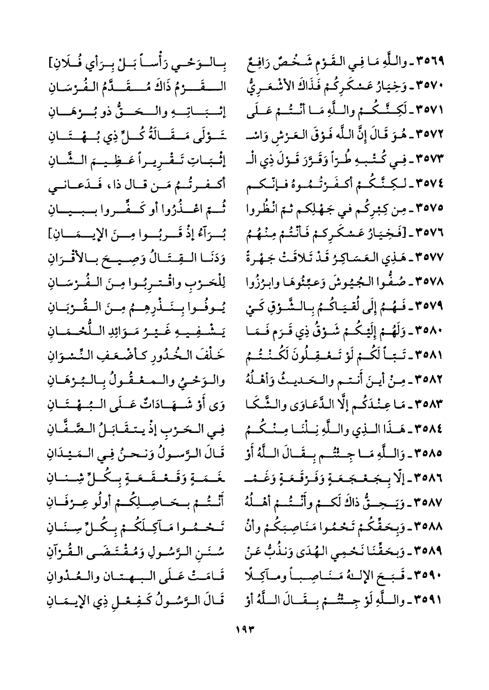 ٣٥٨٩ - وَبحَقِّنَا نَحْمِي الهُدَى وَنذُبُّ عَنْ ... سُنَنِ الرَّسُولِ وَمُقْتَضَى القُرْآنِ