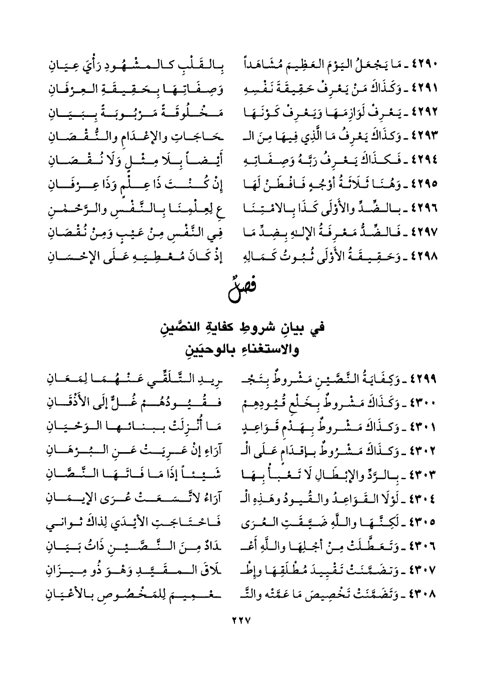 ٤٢٩٩ - وَكِفَايَةُ النَّصَّيْنِ مَشْروطْ بِتَجْـ ... ـرِيدِ التَّلَقِّي عَنْهُمَا لِمَعَانِ