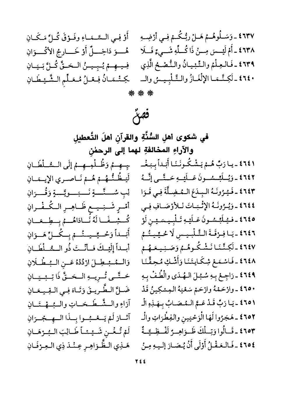 فصلٌ في شكوى أهلِ السُّنَّةِ والقرآنِ أهلَ التَّعطيلِ والآراءِ المخالفة لهما إلى الرحمنِ