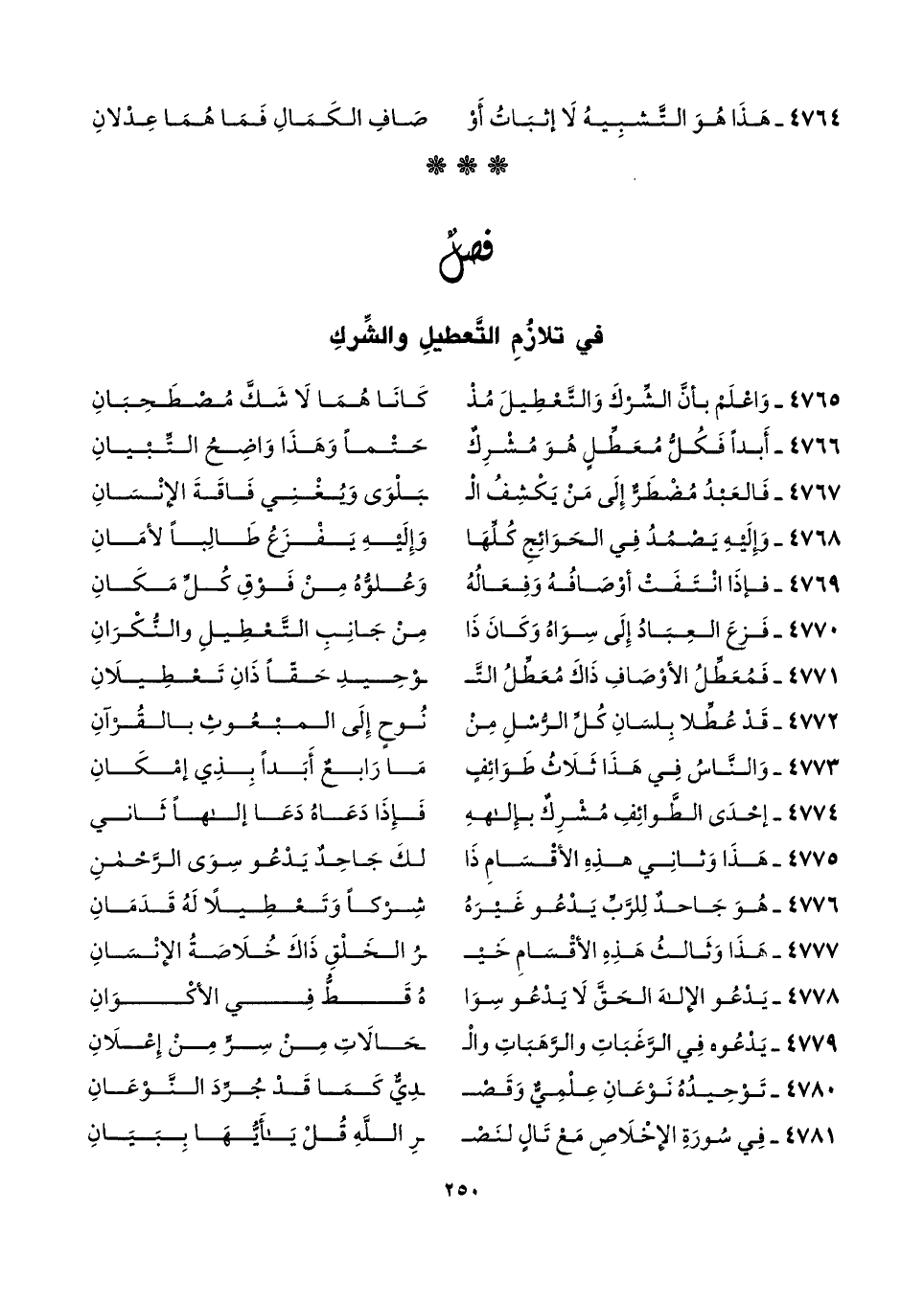 ٤٧٦٥ - وَاعْلَمْ بأنَّ الشِّرْكَ وَالتَّعْطِيلَ مُذْ ... كَانَا هُمَا لَا شَكَّ مُصْطَحِبَانِ